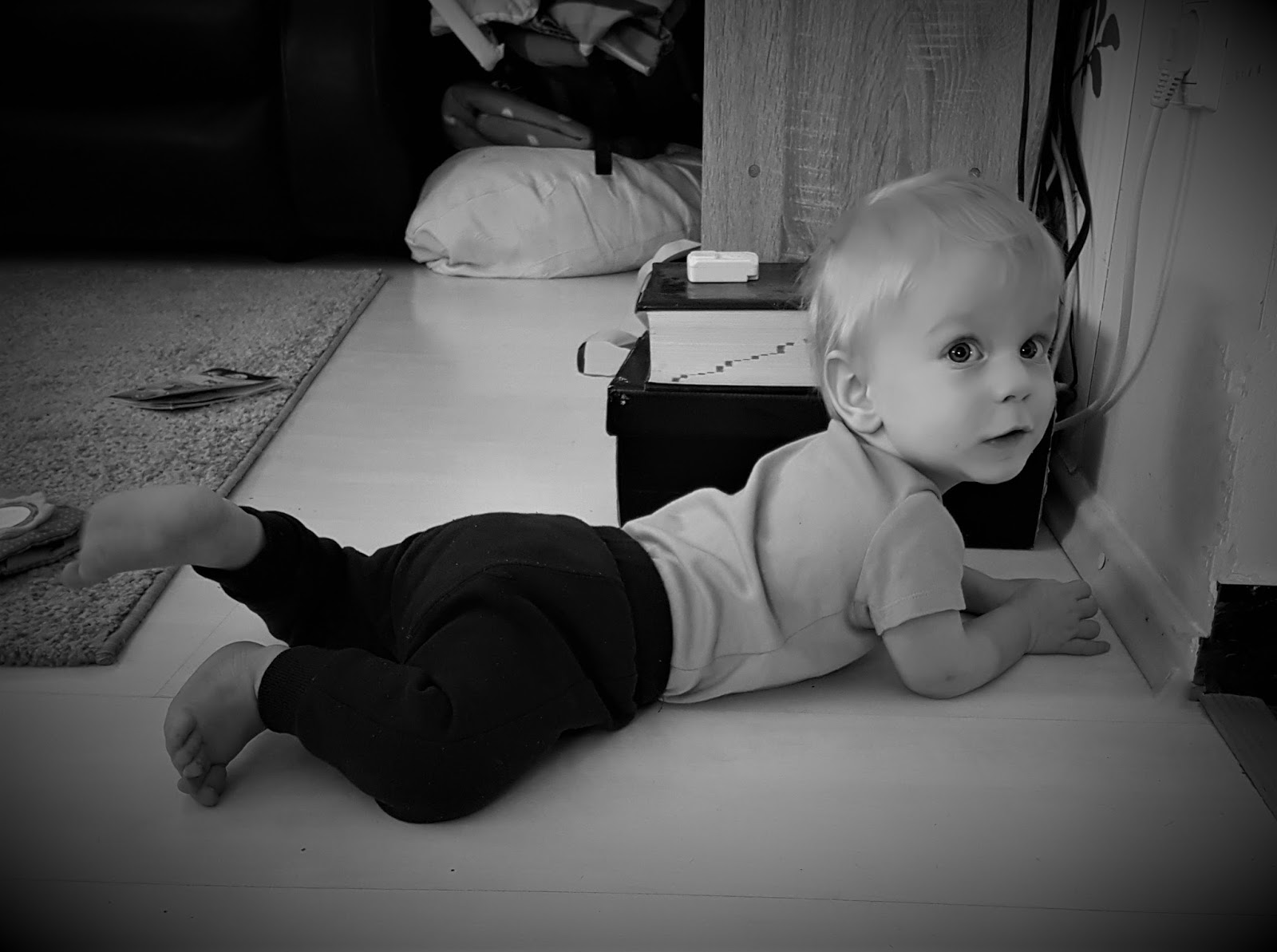 Egy szóval a pici vizsgálódik, anya némán szenved, sőt, még magyaráz is, hogy „igen, ez az orrom, és ha nem marnád ki, akkor nem fájna… és igen, ez a vér, sós, de ne edd meg, nem vagy te vámpír” (mégha így is gondolom időnként). Jogosan merülhet fel bennetek a kérdés, miért nem tanítom meg arra, hogy ezzel vagy azzal a mozdulatával, erőszakos tanulási vágyával marha nagy testi fájdalmat tud okozni. De, azt teszem. Csak valahogy nem akarja tudomásul venni. Pontosabban úgy tesz, mintha nem értené… Pedig már megfigyeltük, hogy ha példának okáért az elosztó felé veszi az irányt (igen, lassan-lassan már kúszik végre…), akkor először ránk néz, hogy jön-e a NEM, aztán ugyzsi és csakazértis lecsap a kábelekre. Ezt naponta százszor eljátsszuk, úgyhogy kiadtam a lányomnak ukázba, tervezzen egy kábelrejtő dobozt.